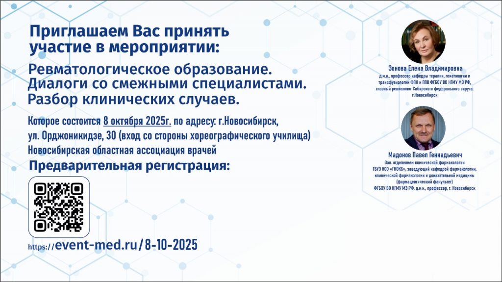 16:00 – 16:10 Приветствие главного ревматолога СФО, профессора кафедры терапии, гематологии и трансфузиологии ФПК и ППВ ФГБОУ ВО НГМУ МЗ РФ, д.м.н. Зоновой Елены Владимировны