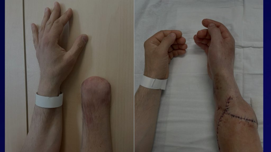 Операция по пересадке кисти длилась больше девяти часов. Движения пальцев появились у пациента сразу после вмешательства, а через пять месяцев он смог выполнять сложные действия, невозможные в случае протезирования: отжиматься от пола, писать ручкой, открывать двери.